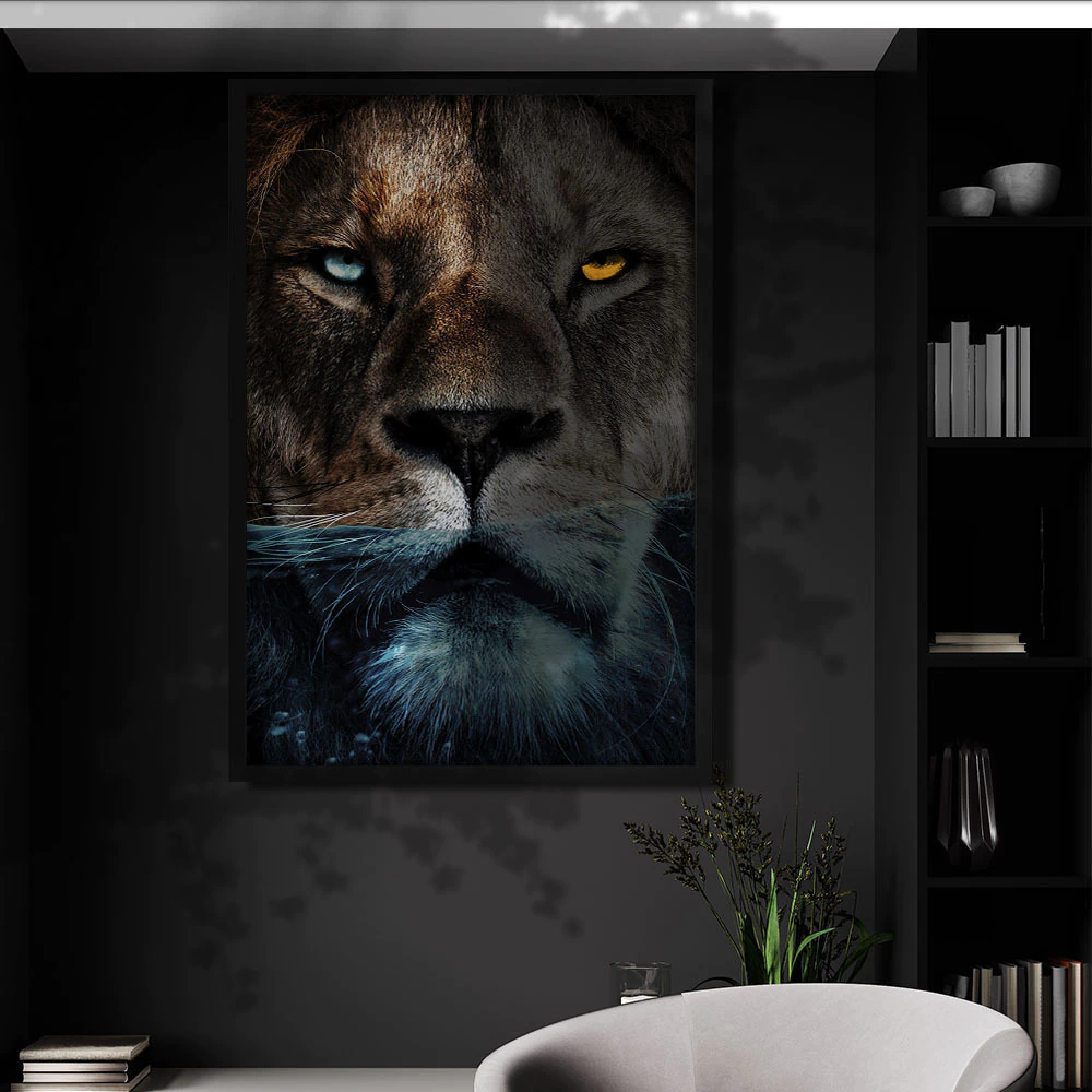 Quadro Decorativo Animais Leão na Água Olhos Coloridos Sombra